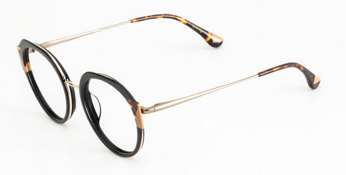 Jeanne è un modello combinato con uno stile arrotondato con laminato bicolore. Il suo acetato italiano di alta qualità che forma gli anelli e le piastrine forniscono un grande comfort.